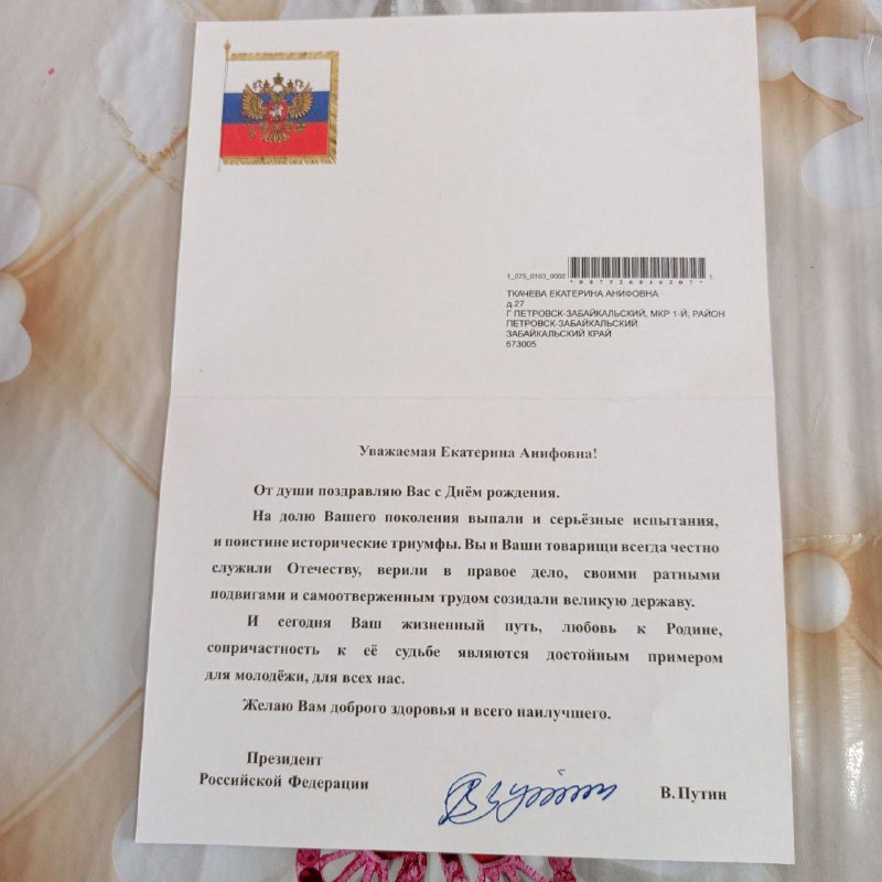Путин поздравил 103-летнюю труженицу тыла из Петровск-Забайкальского Екатерина Ткачёва получила открытку от президента, в которой отмечены её трудовые достижения, преданность Родине и пример для подр