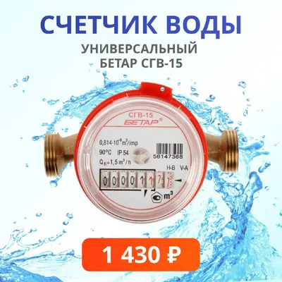 СЧЕТЧИК ВОДЫ БЕТАР СГВ-15 - 1430 руб Счетчик предназначен для измерения объема холодной и горячей питьевой воды, протекающей по трубопроводу при температуре от плюс 5°C до плюс 90 °С при давлении не б