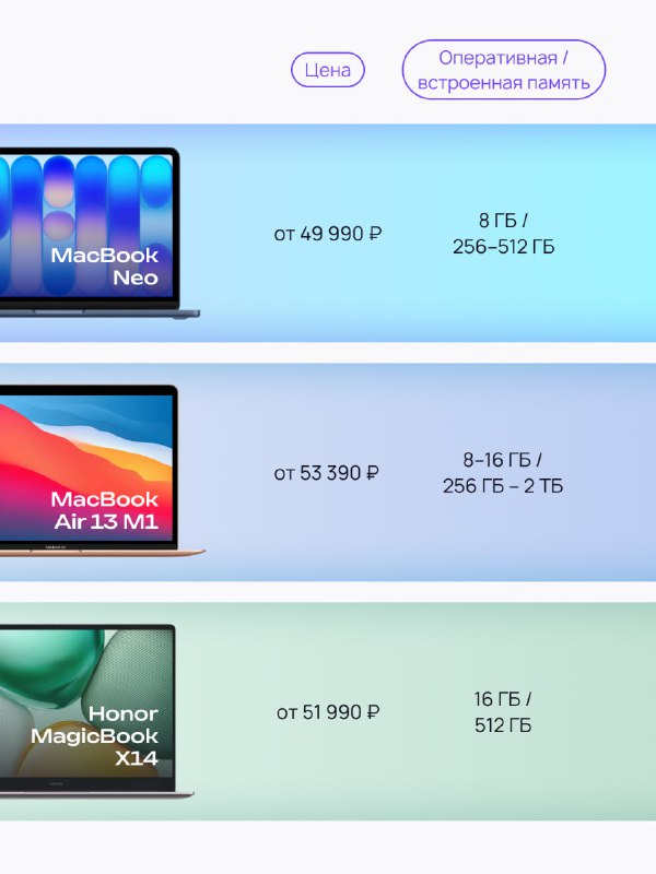 MacBook Neo — топ за свои деньги или есть варианты получше? 💻 В карточках сравнили новинку от Apple с соседями по ценовому сегменту по нескольким важнейшим параметрам. А в нашем блоге подробно расск