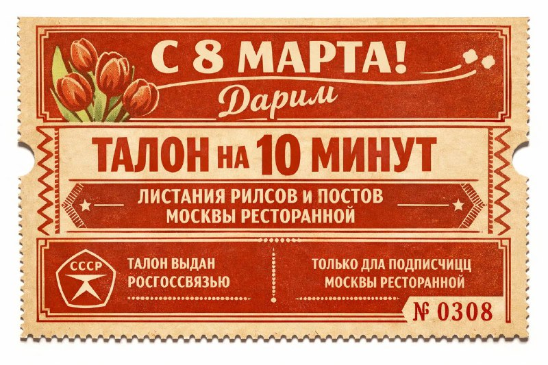 С 8 Марта, дорогие читательницы Москвы ресторанной! 🌷 Сегодня в Москве местами действуют ограничения на связь, поэтому решили подойти к вопросу исторически и подарить вам талон. Дарим на 10 минут л