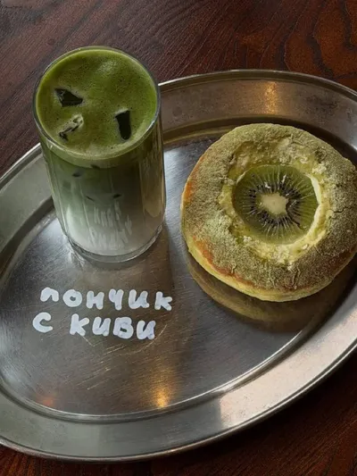 Пончик с киви за 450₽ появился в кафе Skrepka Внутри киви, заварной крем и начинка киви-маракуйя, сверху сахарная пудра с матчей.