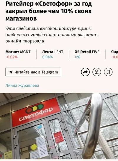 Сеть «Светофор» закрыла 315 магазинов в 2025 году — это 11,6% от общего количе��тва, сообщают «Ведомости». Закрывались не только супермаркеты, но и крупные форматы, включая входящие в сеть гипермаркет