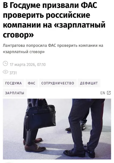 В Госдуме обратились к ФАС с просьбой проверить компании на «зарплатный сговор», сообщают «Известия». «По существу, речь может идти о согласовании кадровой и зарплатной политики между работодателями,