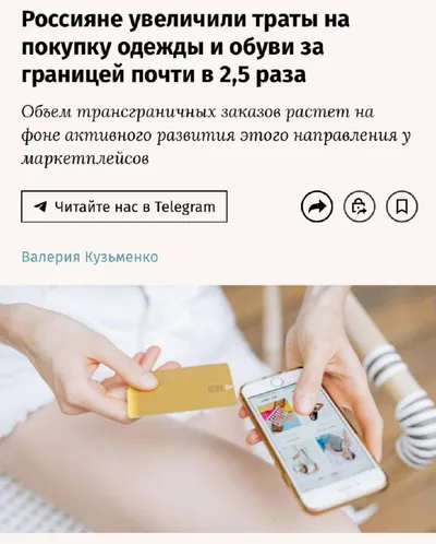 ⚡️ Россияне стали больше тратить на одежду и обувь из-за рубежа. По данным «Ведомостей», в прошлом году расходы на трансграничные заказы в этой категории составили 67,6 млрд рублей, что на 137% больше