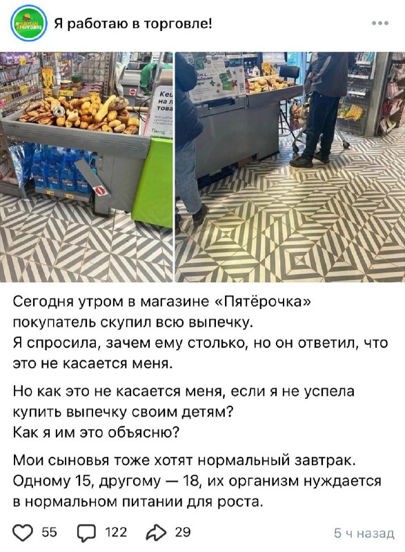 «Мои сыновья тоже хотят завтрак. Их организм нуждается в нормальном питании для роста» Клиентка возмутилась в соцсетях, что мужчина в «Пятёрочке» выкупил всю свежую выпечку, ничего не оставив другим.