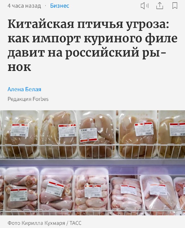 Импорт куриного филе из Китая в Россию за три года увеличился в 39 раз и в 2025 году приблизился к 115 тысячам тонн. Теперь на Китай приходится почти треть всего ввозимого в страну мяса птицы, сообщил
