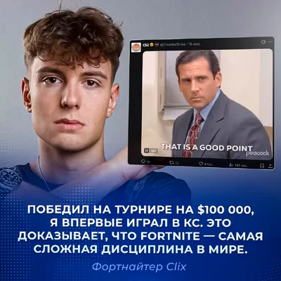 👌 «Fortnite — самая сложная дисциплина в мире» — заявил фортнайтер Clix. К такому выводу он пришел после того, как впервые зашёл в КС и сразу же выиграл медиа-турик на $100 000. Ему даже ответили р