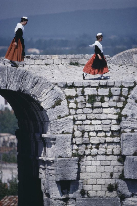Арль, Франция, 1979 год Девушки в традиционных прованских костюмах шагают по стенам, римского амфитеатра, построенного в 90 году н. э. 🔤🔤🔤🔤🔤▶️