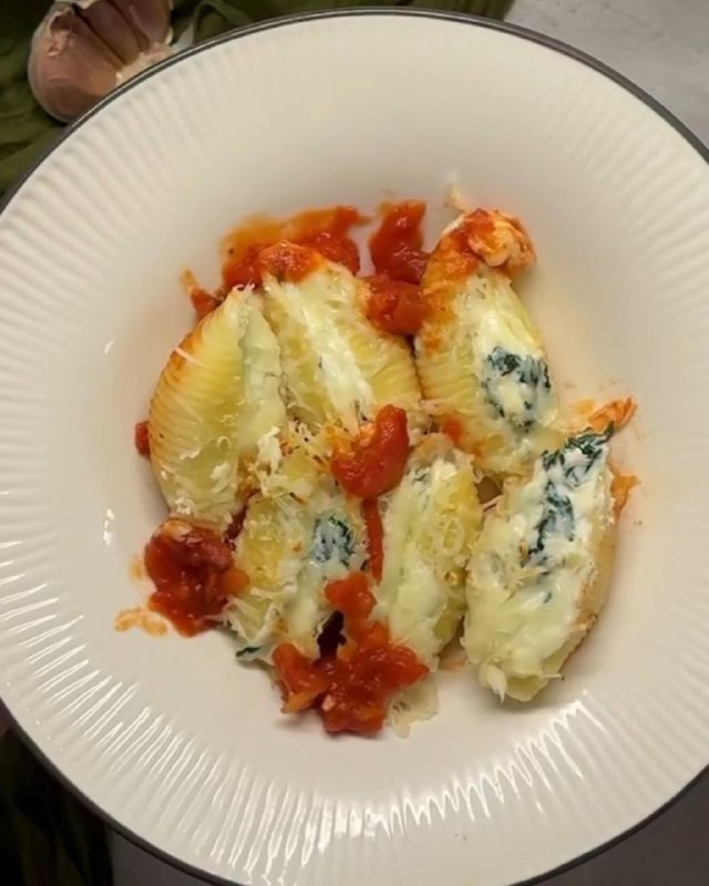 Запеченные ракушки с рикоттой, шпинатом и моцареллой