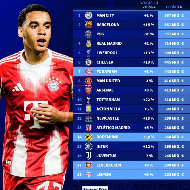 📊 Клубы с самыми высокими затратами на заработную плату в 2025 году, по данным УЕФА (игроки, тренеры и сотрудники клубов) 🖥 Transfermarkt