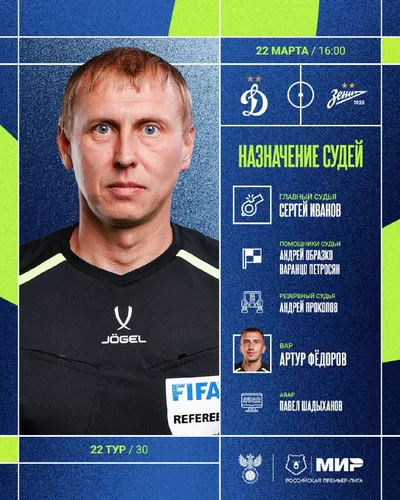 🚩 💙🩵 Сергей Иванов – главный арбитр матча #ДинамоЗенит РФС публикует назначения арбитров на 22-й тур Мир РПЛ.