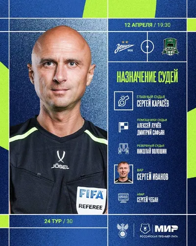 🚩 🩵💚 Сергей Карасёв – главный арбитр матча #ЗенитКраснодар РФС публикует назначения арбитров на 24-й тур Мир РПЛ.