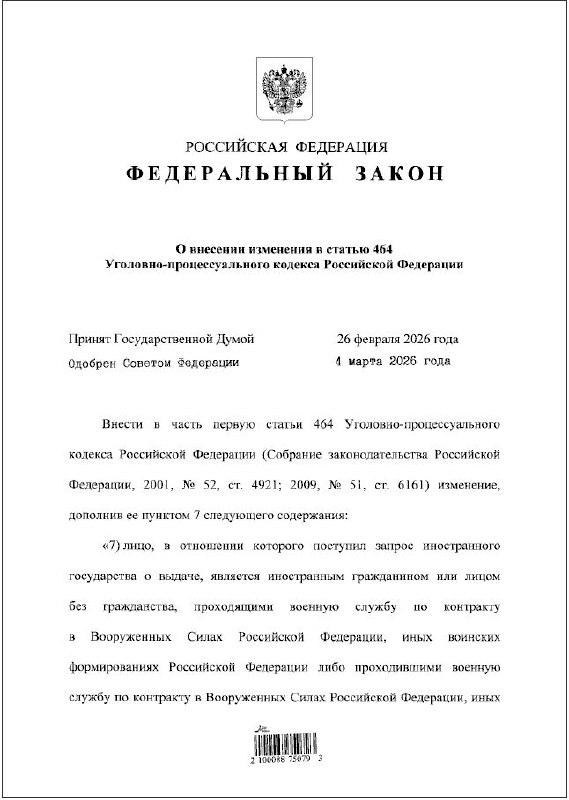 Из России нельзя будет депортировать иностранных граждан и лиц без гражданства, служащих по контракту в Вооруженных Силах РФ или принимавших участие в боях на стороне России. Владимир Путин подписал