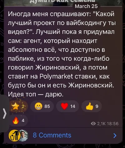 😱 ИИ-АГЕНТ ЖИРИНОВСКИЙ: гении сделали нейронку, которая думает, что она Владимир Вольфович Нейросеть грузит себя предсказаниями политика и делает ставки на Polymarket. ИИ скормили все интервью, выс