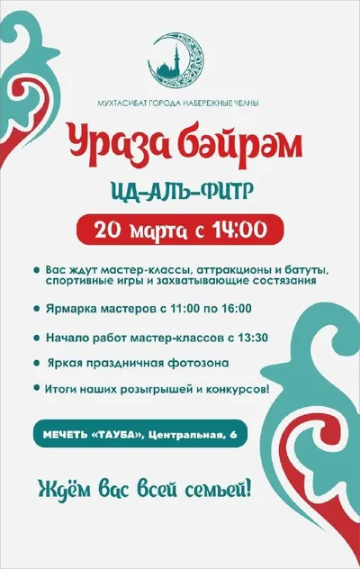 Мухтасибат города Набережные Челны приглашает жителей и гостей города на общегородской праздник Ураза-байрам 2026. Мероприятие пройдет 20 марта с 11:00 до 16:00 на территории мечети "Тауба" и набер