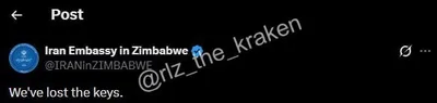 🤣 "Мы потеряли ключи" - иранское посольство в Зимбабве с сожалением отклонило вежливую просьбу Трампа открыть Ормуз. Забавно, что инфовойна и троллинг противника у иранцев также децентрализована: ка