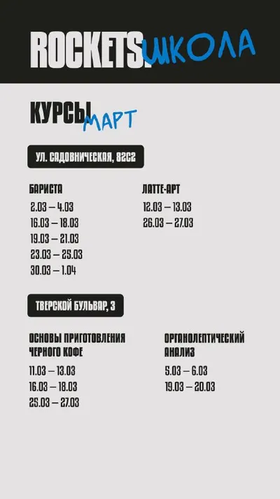 📌Расписание на март Подробнее о курсах и мастер-классах на rockets.coffee Регистрация на каппинг открывается за день до указанной даты ✅