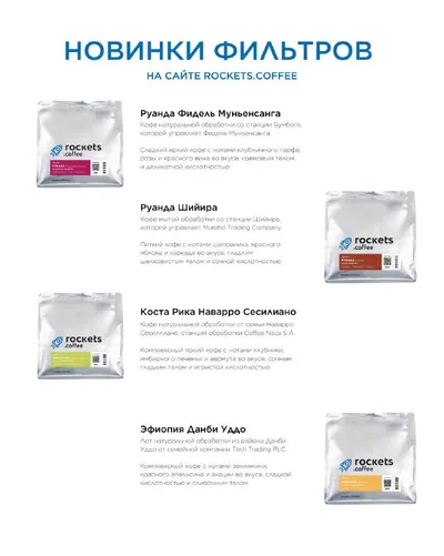 Четыре новых фильтра появилось в rockets 🚀 Рассказываем подробнее: КОСТА РИКА НАВАРРО СЕСИЛИАНО Комплексный яркий кофе с нотами клубники, имбирного печенья и вермута во вкусе, сочным гладким телом и