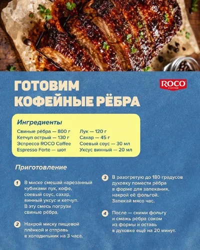 Ну как в ресторане! Или даже вкуснее! Принесли рецепт свиных рёбер с кофейной корочкой, которая не оставит шанса твоей диете. Для аромата и стойкого вкуса кофе используй ROCO Coffee Espresso Forte