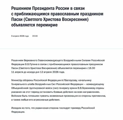 Немного 🤏 политики, но приятной. Путин объявил пасхальное перемирие, — Кремль🇷🇺 Оно объявляется с 16:00 11 апреля до захода солнца 12 апреля
