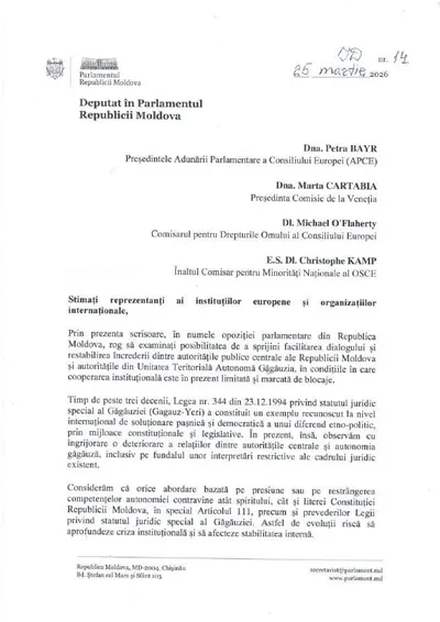 Партии парламентской оппозиции подписали совместное обращение в адрес Совета Европы, Венецианской комиссии и ОБСЕ с требованием вмешаться в попытку властей Молдовы пересмотреть автономный статус Гагау