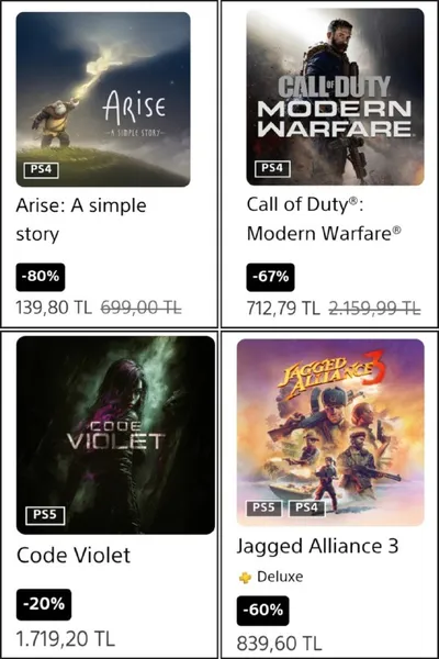 По хорошей цене сейчас можно приобрести: • Arise: A Simple Story (-80%) — 336₽/140₺ 548₽/332₨ 403₽/130₴ 18zl 🇷🇺 Субтитры • Call Of Duty: Modern Warfare (-67%) — 1712₽/713₺ 2721₽/1649₨ 2084₽/672₴ 9