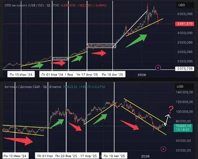 BTC vs GOLD Скрин 1. Уже показывал эту раскорреляцию между BTC и золотом в прошлых постах, сейчас наблюдаем как Золото снизилось ниже трендовой линии поддержки, в это же время BTC приближается к в