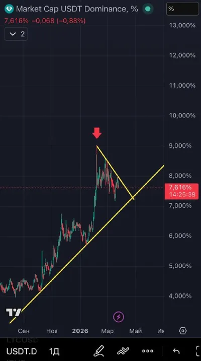 USDT.D Tether Dominance - отражает долю капитализации стейблкоина USDT 🟢 Рост USDT.D • капитал переходит в стейблкоины; • усиливается давление на рынок. 🔴Падение USDT.D • капитал возвращается в B