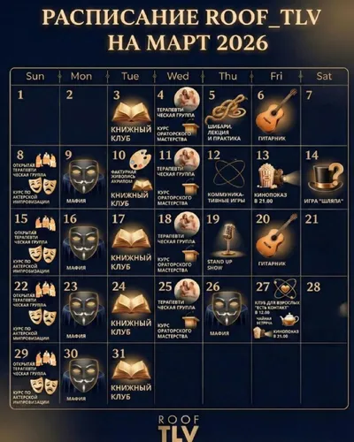 Расписание: 🙂 15/03 Открытая терапевтическая группа https://telegra.ph/Psihoterapevticheskaya-gruppa-05-24 🎭15/03 Курс по актерской импровизации https://t.me/roof_tlv/3323 ♠️16/03 Мафия https://