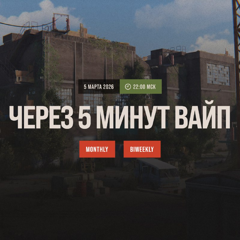 Через 5 минут на сервер Monthly и Biweekly произойдёт вайп. На Biweekly сервере чертежи будут удалены, а на Monthly сервере они останутся. 🗺 Голосованием в Discord выбраны карты на сервера Monthly