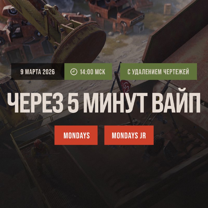 Через 5 минут на серверах Mondays и Mondays JR произойдёт глобал вайп! 🗺 Голосованием в Discord выбраны карты на сервера Mondays - Mondays JR Rust Room [Mondays]: connect mondays.rustroom.gg Rust R