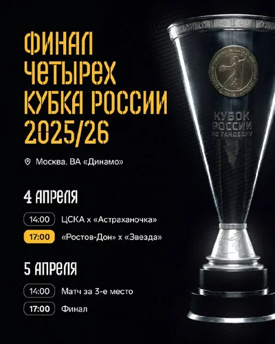Расписание матчей «Финала четырех» Кубка России 2025/26 🔥 🗓 4 апреля 14:00 ЦСКА – Астраханочка 17:00 Ростов-Дон – Звезда 🗓 5 апреля: 14:00 Матч за 3 место 17:00 Финал 📍ВА «Динамо», Москва @ro