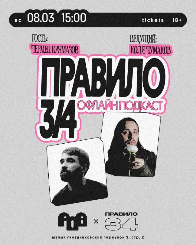 Правило 34 × Ровесник подкаст-шоу «Правило 34» снова пройдет в Ровеснике! постоянный ведущий Коля Чумаков и стендап-комик Чермен Качмазов откровенно обсудят отношения, секс, аниме и поговорят о маск