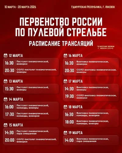 Сохраняем и делимся!💥 Расписание трансляций Первенства России по пулевой стрельбе в городе Ижевске, Удмуртская республика (по местному времени). Прямые трансляции финалов будут доступны в нашей гру