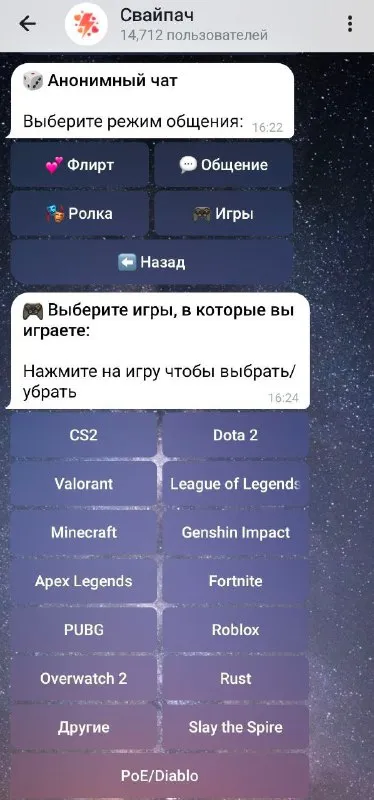 Хочешь найти себе друга-игрулькина, с кем позалипать в кооп? Ищи в Свайпаче В боте можно найти не только тяночку, чтобы няшиться с ней под пледиком, но и друга для совместных игрулек. Верный приятел