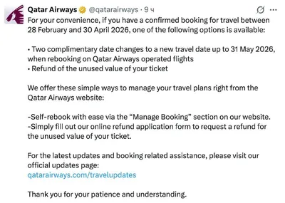 🇶🇦 Qatar Airways обновила условия обмена и возврата билетов на фоне отмен рейсов Изменения действуют для перелетов с 28 февраля по 30 апреля 2026 года. Пассажиры могут:📌 — до двух раз изменить да