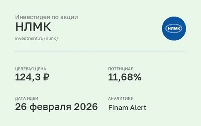 Инвестидея по акции НЛМК #NLMK • Целевая цена: 124,3 (11,68%) • Дата идеи: 26 февраля 2026 • Аналитики: Finam Alert