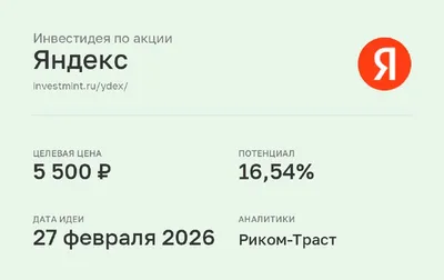 Инвестидея по акции Яндекс #YDEX • Целевая цена: 5 500 (16,54%) • Дата идеи: 27 февраля 2026 • Аналитики: Риком-Траст