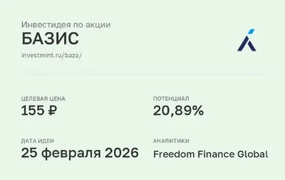Инвестидея по акции БАЗИС #BAZA • Целевая цена: 155 (20,89%) • Дата идеи: 25 февраля 2026 • Аналитики: Freedom Finance Global
