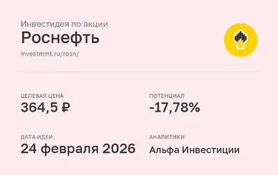 Инвестидея по акции Роснефть #ROSN • Целевая цена: 364,5 (-17,78%) • Дата идеи: 24 февраля 2026 • Аналитики: Альфа Инвестиции
