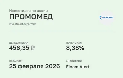 Инвестидея по акции ПРОМОМЕД #PRMD • Целевая цена: 456,35 (8,38%) • Дата идеи: 25 февраля 2026 • Аналитики: Finam Alert