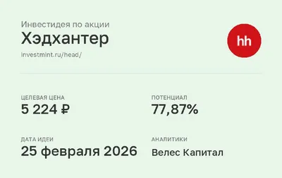 Инвестидея по акции Хэдхантер #HEAD • Целевая цена: 5 224 (77,87%) • Дата идеи: 25 февраля 2026 • Аналитики: Велес Капитал