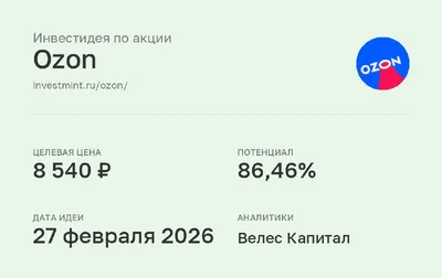 Инвестидея по акции Ozon #OZON • Целевая цена: 8 540 (86,46%) • Дата идеи: 27 февраля 2026 • Аналитики: Велес Капитал