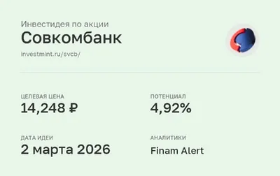 Инвестидея по акции Совкомбанк #SVCB • Целевая цена: 14,248 (4,92%) • Дата идеи: 2 марта 2026 • Аналитики: Finam Alert