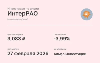 Инвестидея по акции ИнтерРАО #IRAO • Целевая цена: 3,083 (-3,99%) • Дата идеи: 27 февраля 2026 • Аналитики: Альфа Инвестиции