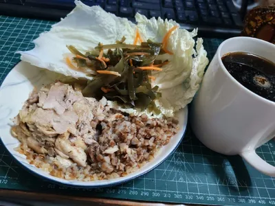 Завтракаю, гречка курица, пекинка и салат с водорослями. Кофе без сахара. Всем приятного аппетита! 😀