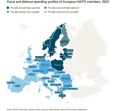 Любопытная инфографика в последнем докладе Мюнхенской конференции. Fiscally stable – европейские страны-члены НАТО со стабильными госфинансами – и fiscally strained – страны с бюджетными трудностями –