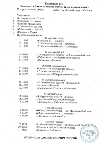 Календарь игр женского Чемпионата🔄 7️⃣ команд стартует в Иркутске 2️⃣7️⃣ марта⬇️ Соперниц ждет круговой турнир до 2️⃣ апреля⚡️ Встречаем красивый весенний хоккей! #Женскийхоккей2026