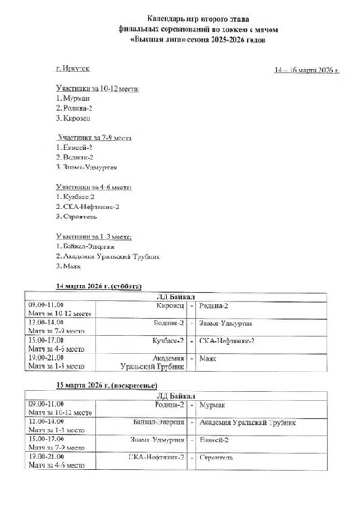 КАЛЕНДАРЬ второго этапа финала в Иркутске🗓 Матчи за 1-3 места: 🧊🗽🟢 Матчи за 4-6 места: ⛏️⭐️🏗 Матчи за 7-9 места: ⛴️🌊🧙 Матчи за 10-12 места: 🐟🟩🧑🦳 Ждем болельщиков в ЛД "Байкал"! #Высш