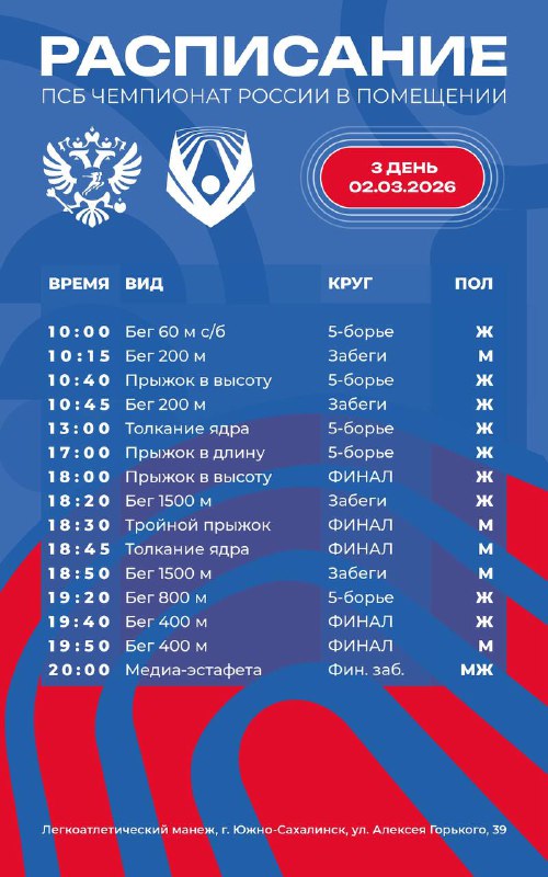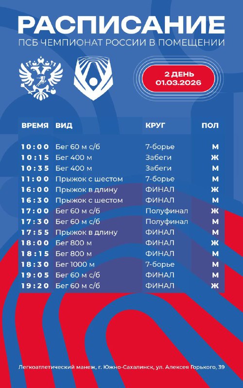 😀😀😀😀😀😀 🏆 ПСБ Чемпионат России в помещении: день второй Доброе утро, Сахалин! Не сбавляем соревновательного темпа и продолжаем следить за главным стартом сезона на Сахалине. Трансляции дост